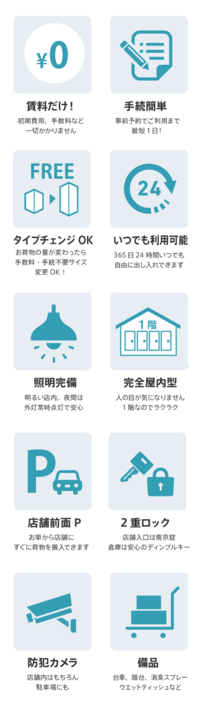 | 荷下ろし | 倉庫の入り口に車を横付け | 駐車場あり 2階3階はエレベーターで不便なことも | 上段のコンテナは出し入れしにくい 雨の日は濡れてしまう 人の目が気になる |